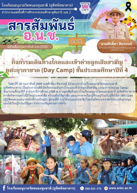วันศุกร์ที่ 20 กุมภาพันธ์ 2569 นายศักดิ์ดา ทิพวรรณ์ ผู้อำนวยการโรงเรียนอนุบาลวัดหนองขุนชาติ (อุทิศพิทยาคาร) เป็นประธานในพิธีเปิดกิจกรรมเดินทางไกลและเข้าค่ายลูกเสือสามัญ และยุวกาชาด (Day Camp) ชั้นประถมศึกษาปีที่ 4